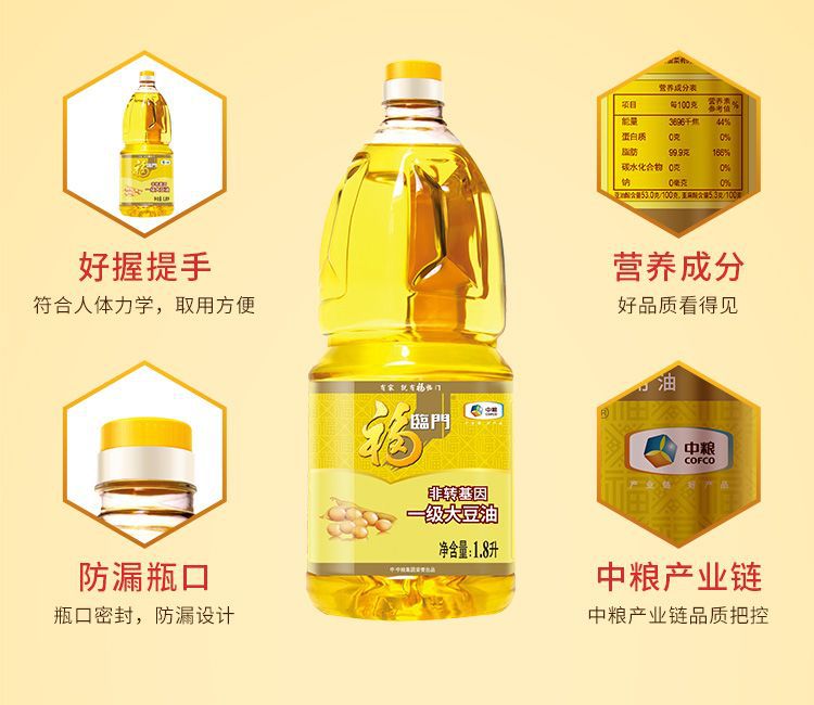 福临门非转基因一级大豆油1.8L植物油食用油色拉油炒菜家庭装